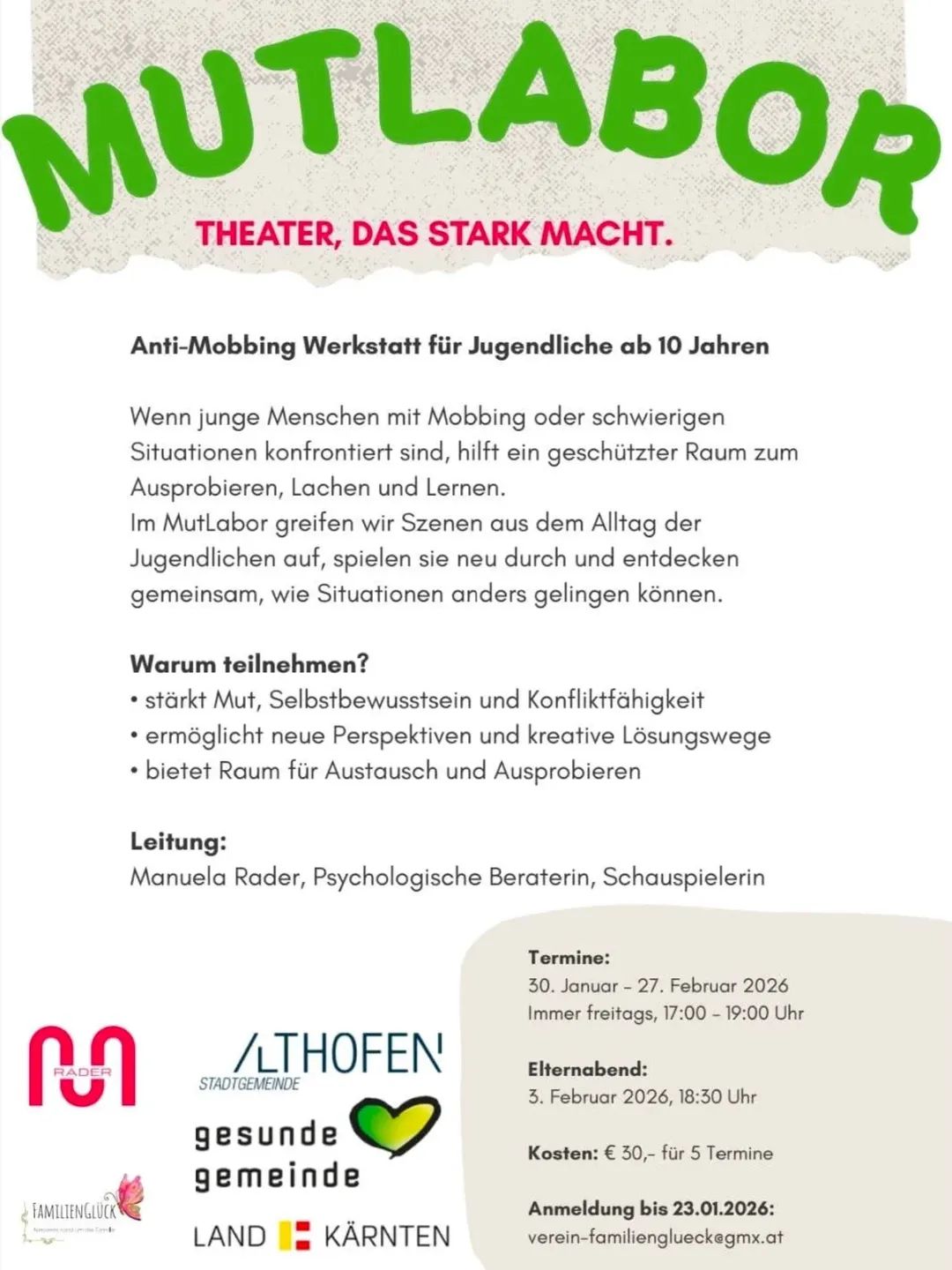Anmeldung bis 23. Jänner mit Angabe von Name und Alter des Kindes unter verein-familienglueck@gmx.at. Das MutLabor wird von der „Gesunden Gemeinde“ Althofen, dem Gesundheitsreferat des Landes Kärnten und dem Verein FamilienGlück unterstützt.
