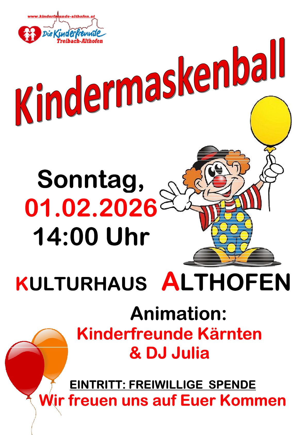 Die Kinderfreunde Althofen laden am Sonntag, dem 1. Februar, zum Kindermaskenball ins Kulturhaus Althofen.