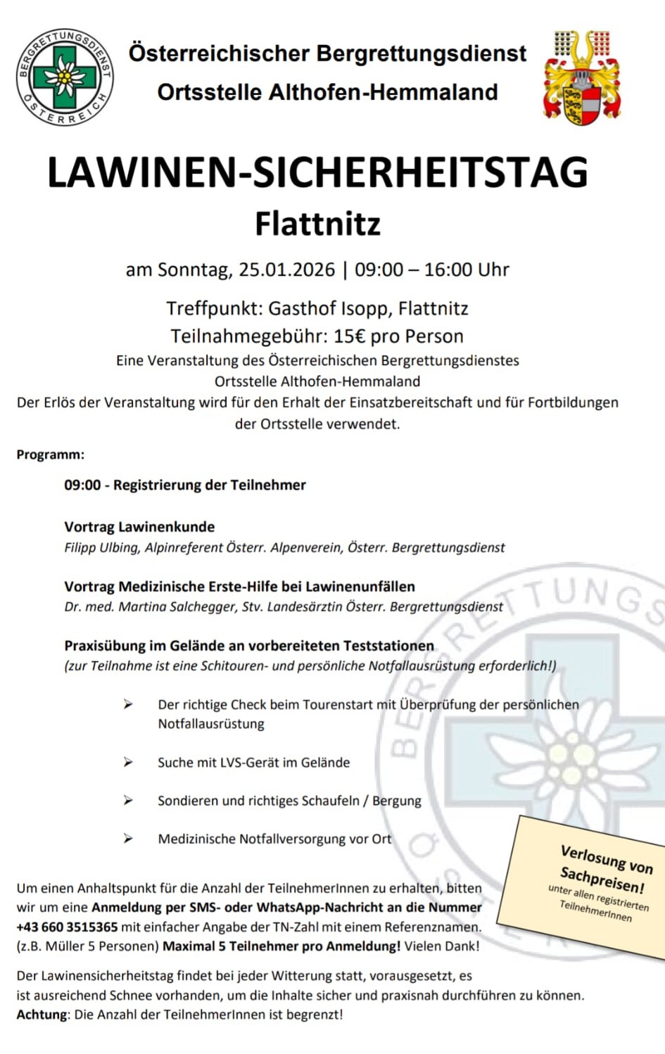 Die Ortsstelle Althofen-Hemmaland des Österreichischen Bergrettungsdienstes lädt am Sonntag, 25. Jänner, von 09:00 bis 16:00 Uhr zu einem Lawinensicherheitstag auf der Flattnitz ein. Geboten werden spannende Theorievorträge sowie praktische Outdoorübungen, bei denen alle Teilnehmerinnen und Teilnehmer aktiv mitmachen können. Treffpunkt ist um 09:00 Uhr beim Gasthof Isopp. Anmeldungen sind per SMS oder WhatsApp unter 0660/3515365 möglich. Schnell sein lohnt sich – die Teilnehmerzahl ist begrenzt.