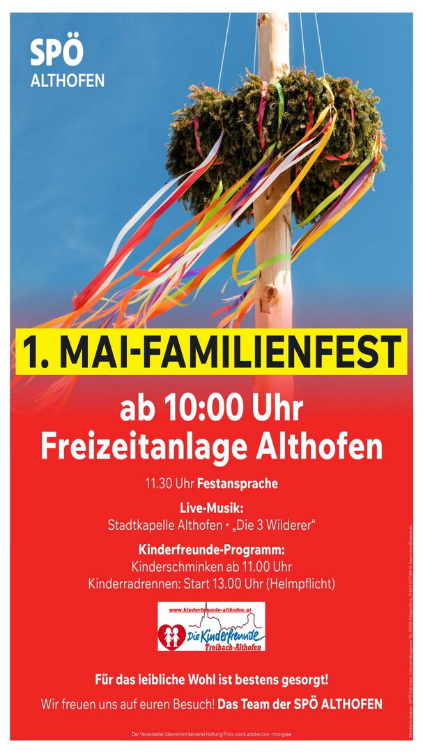 Das 1. Mai-Familienfest der SPÖ Treibach-Althofen findet in der Freizeitanlage statt. Beginn ist um 10:00 Uhr.